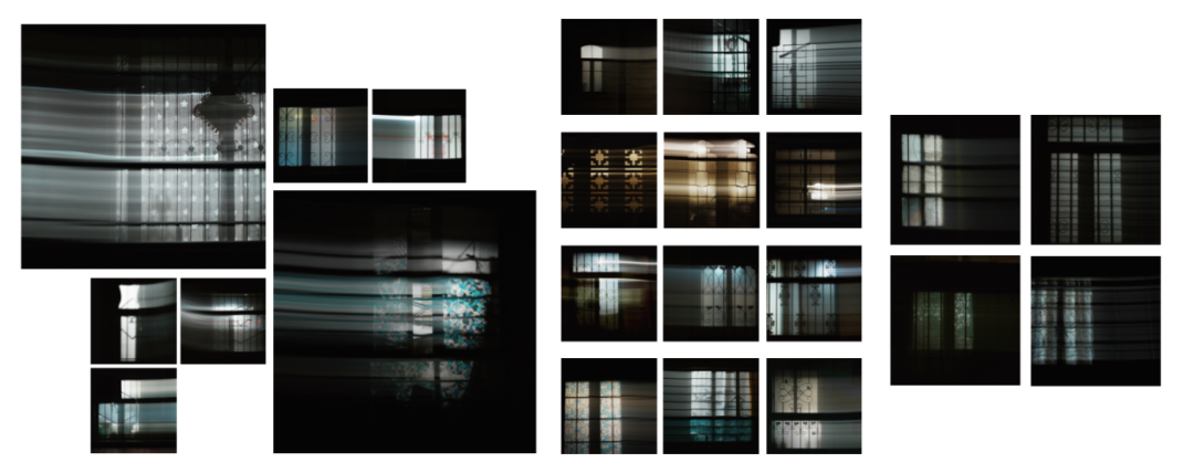 转机出现在对普通居民小区的走访。韩金阳观察到,尽管小区窗户的规制统一,但每户人家个性化的防盗网、防窥贴纸、各式窗帘,都让原本平凡的窗变得与众不同、生动有趣。这些窗户的铁艺或许不如景点洋房那般精致,但其背后却是一个个温暖的家庭,一段段鲜活的故事。正是这些充满生活气息与真挚情感的细节——花瓣般散发暖黄色光芒的吊灯、朦胧的纱帘、窗沿的盆栽玩具、窗外卷曲的铁艺护栏——共同构成了一幅幅饱含艺术气息的画面。每一扇窗,都因独特的家庭生活而拥有了独一无二的“名字”与温度,宛如夜空中闪烁的星辰。